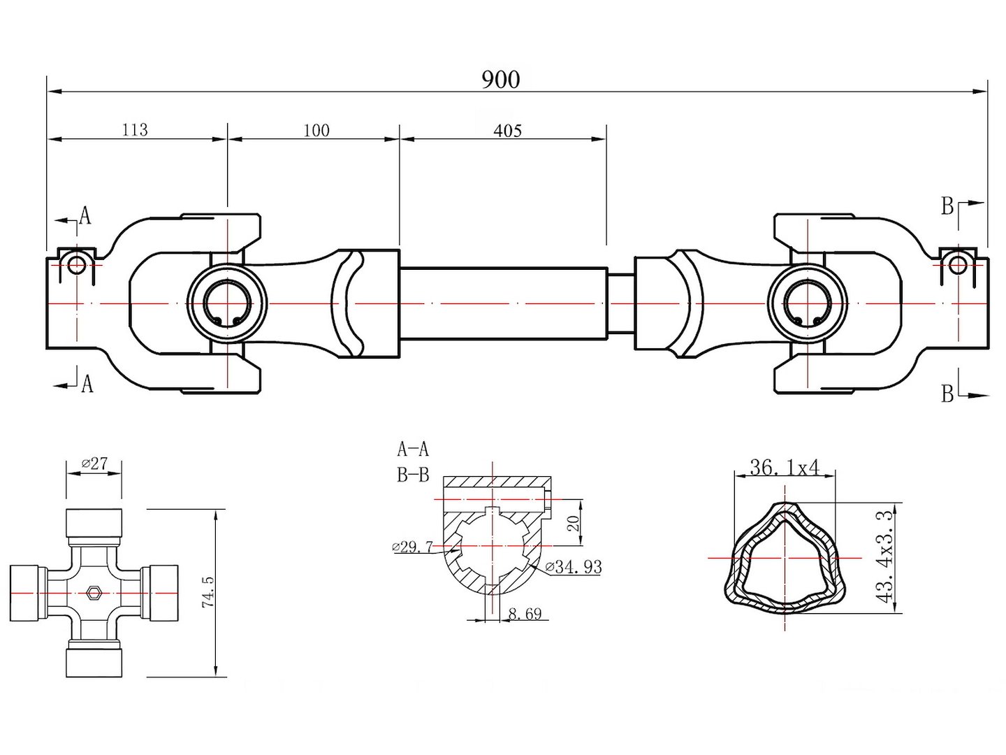 • Przeguby krzyżakowe: 27 x 74.5 mm